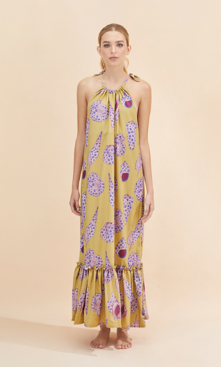 Halter neck dress with skirt in sections and lower grommet printed with snails.