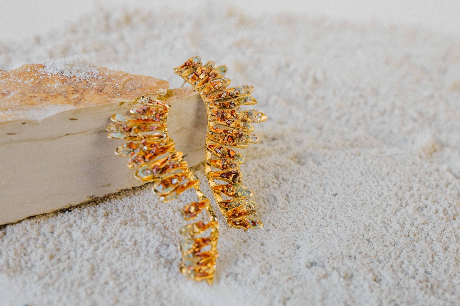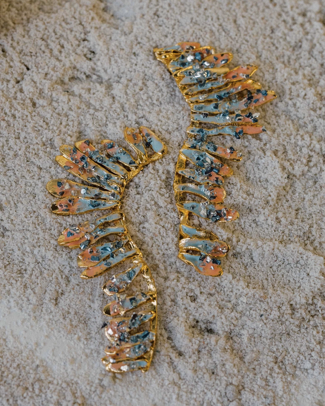 Handmade with 24k gold plated over bronze, pigments applied by hand and granulation in glass.